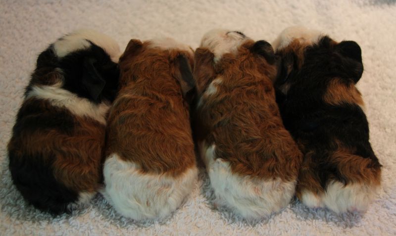 L2-Nest; 13-10-2014; Esra (CH-Teddy, zwart/rood/wit) X Jafar (CH-Teddy, slateblue/goud/wit): 4 beertjes in driekleur (zwart/rood/wit).